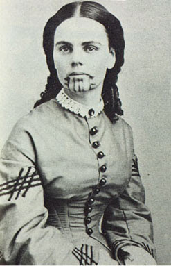 Olive Oatman is considered the first tattooed American white woman. In 1851 Tonto Apaches killed her family in southern Arizona and captured her, at the age of 13, together with her sister, Mary Ann, who was seven years old at the time. After a year of slavery Mojaves bought them. Her sister died during a famine. Olive got from Mojaves a tribal tattoo on her chin during her puberty ritual. In 1856 she was released. The Oatman affair rose huge curiosity and was covered by newspapers.